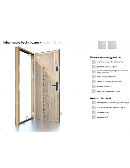 Do stworzenia ramy modelu wewnętrznego wejściowego do mieszkań Maroko posłużyło nam najwyższej jakości drewno iglaste. Całość wypełniona została płytą wiórową. Skrzydło zostało oklejone płytą MDF frezowaną, którą z kolei pokryliśmy wytrzymałą folią dekoracyjną PVC o grubości 0,35 mm. Zaufaliśmy technologii okleinowania bez łączenia na krawędziach przylgi, która gwarantuje nadzwyczajną wytrzymałość okleiny oraz estetykę wykończenia. Te drzwi posłużą Państwu przez lata.