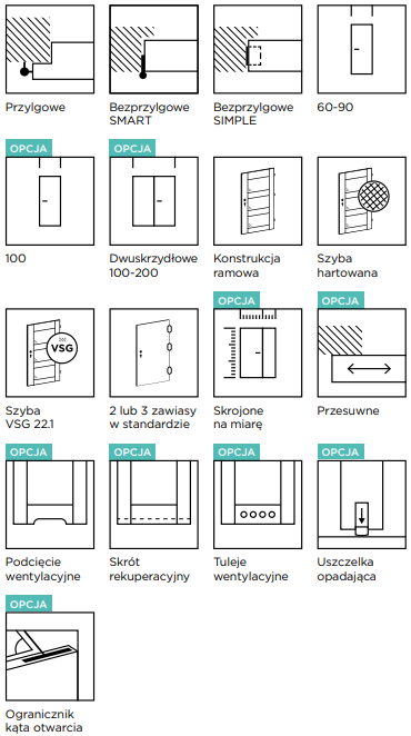 Dostępne opcje dodatkowe to technologia bezprzylgowa SIMPLE, szyba VSG 2.2.1 w wersji Satyna lub Czarna, niestandardowe rozmiary, system przesuwny oraz system dwuskrzydłowy. Możliwość wyposażenia drzwi w uszczelkę opadającą oraz różne opcje wentylacji (podcięcie, tuleje lub kratka) pozwalają na jeszcze większą personalizację i dostosowanie do indywidualnych potrzeb użytkowników. Kratka wentylacyjna dostępna jest dla drzwi o szerokości „80” i szerszych.