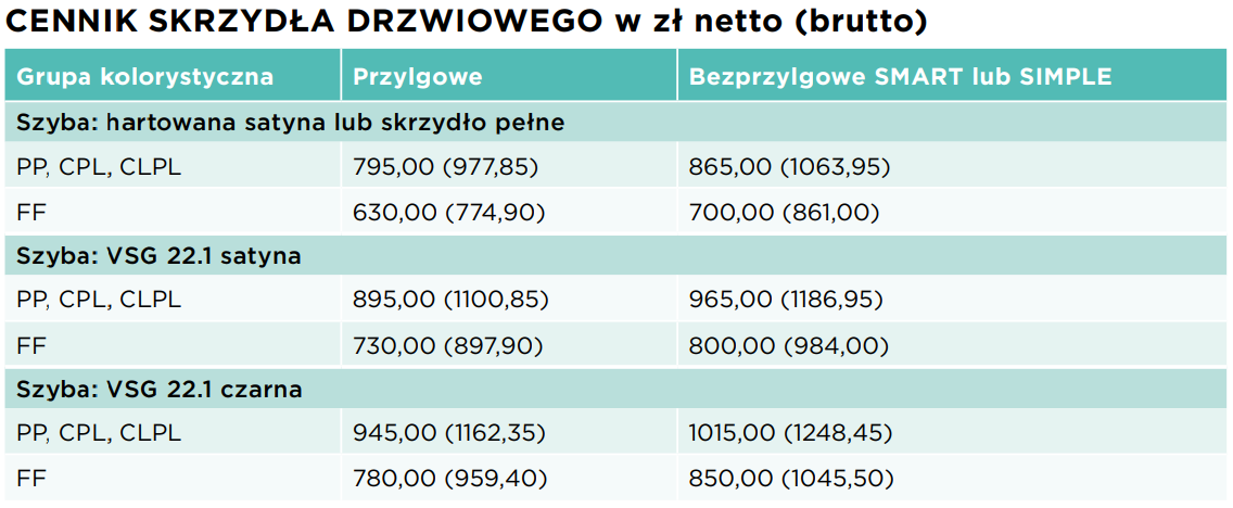 Dostępne opcje dodatkowe to technologia bezprzylgowa SIMPLE, szyba VSG 2.2.1 w wersji Satyna lub Czarna, niestandardowe rozmiary, system przesuwny oraz system dwuskrzydłowy. Możliwość wyposażenia drzwi w uszczelkę opadającą oraz różne opcje wentylacji (podcięcie, tuleje lub kratka) pozwalają na jeszcze większą personalizację i dostosowanie do indywidualnych potrzeb użytkowników. Kratka wentylacyjna dostępna jest dla drzwi o szerokości „80” i szerszych.