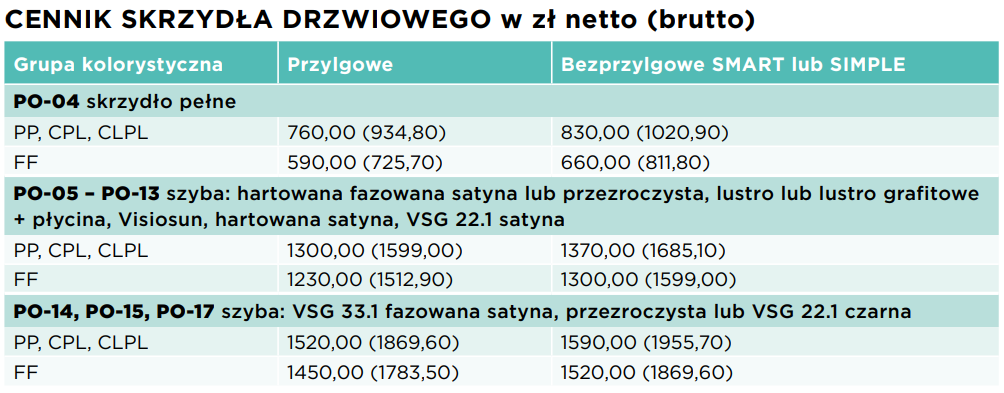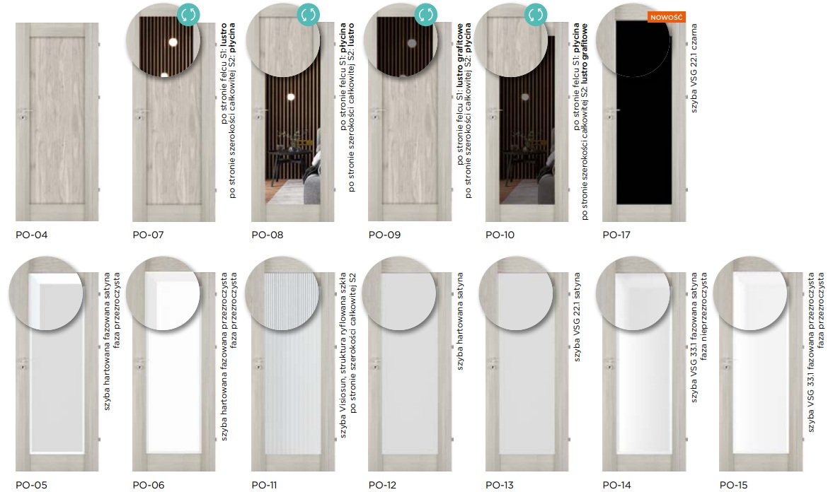 Dostępne opcje dodatkowe to technologia bezprzylgowa SIMPLE, szyba VSG 2.2.1 w wersji Satyna lub Czarna, niestandardowe rozmiary, system przesuwny oraz system dwuskrzydłowy. Możliwość wyposażenia drzwi w uszczelkę opadającą oraz różne opcje wentylacji (podcięcie, tuleje lub kratka) pozwalają na jeszcze większą personalizację i dostosowanie do indywidualnych potrzeb użytkowników. Kratka wentylacyjna dostępna jest dla drzwi o szerokości „80” i szerszych.