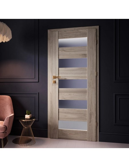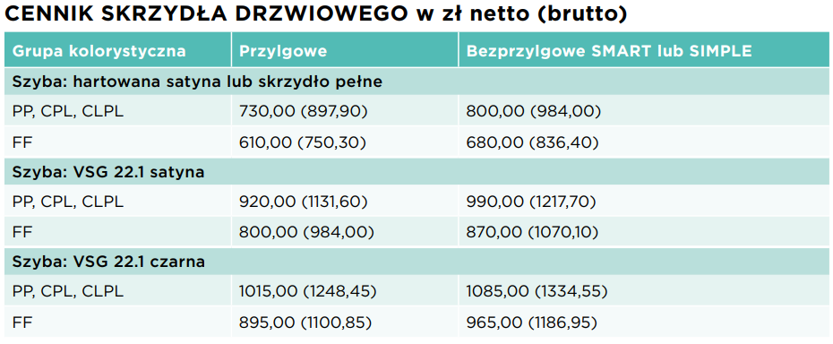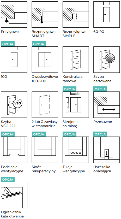 Dostępne opcje dodatkowe to technologia bezprzylgowa SIMPLE, szyba VSG 2.2.1 w wersji Satyna lub Czarna, niestandardowe rozmiary, system przesuwny oraz system dwuskrzydłowy. Możliwość wyposażenia drzwi w uszczelkę opadającą oraz różne opcje wentylacji (podcięcie, tuleje lub kratka) pozwalają na jeszcze większą personalizację i dostosowanie do indywidualnych potrzeb użytkowników. Kratka wentylacyjna dostępna jest dla drzwi o szerokości „80” i szerszych.