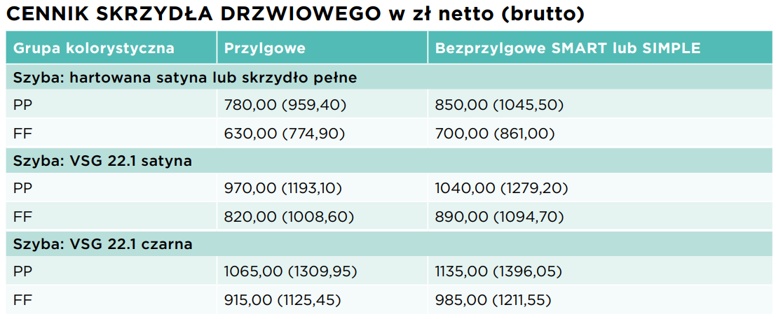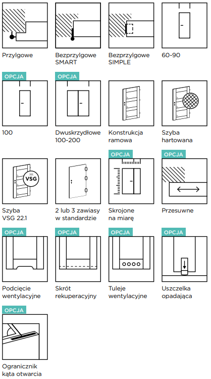 Dostępne opcje dodatkowe to technologia bezprzylgowa SIMPLE, szyba VSG 2.2.1 w wersji Satyna lub Czarna, niestandardowe rozmiary, system przesuwny oraz system dwuskrzydłowy. Możliwość wyposażenia drzwi w uszczelkę opadającą oraz różne opcje wentylacji (podcięcie, tuleje lub kratka) pozwalają na jeszcze większą personalizację i dostosowanie do indywidualnych potrzeb użytkowników. Kratka wentylacyjna dostępna jest dla drzwi o szerokości „80” i szerszych.