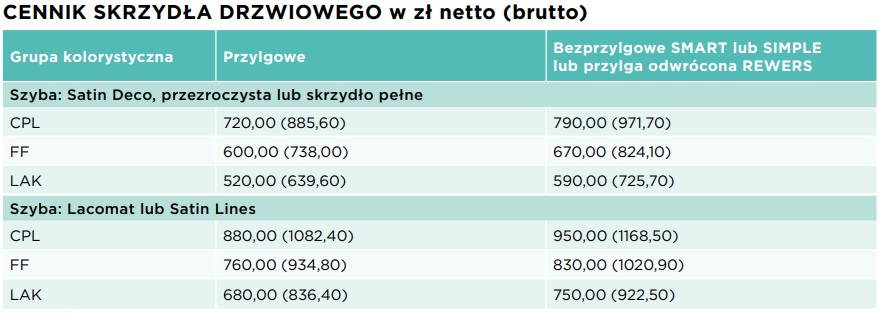 Dostępne opcje dodatkowe obejmują wypełnienie płytą pełną, trzeci zawias zwiększający wytrzymałość na obciążenia, krawędź soft (zaokrąglona, z obrzeżem wykładanym na powierzchnię skrzydła), podwójny ramiak drewniany oraz felc 20 mm. Ponadto, można zamówić drzwi w niestandardowych rozmiarach, w systemie dwuskrzydłowym lub przesuwnym, z technologią bezprzylgową SIMPLE, drzwi dwukolorowe, system Contrast, system rewersyjny, wzmocnienie pod samozamykacz oraz różne opcje wentylacji (podcięcie, tuleje lub kratka). Dodatkowo dostępna jest uszczelka opadająca.