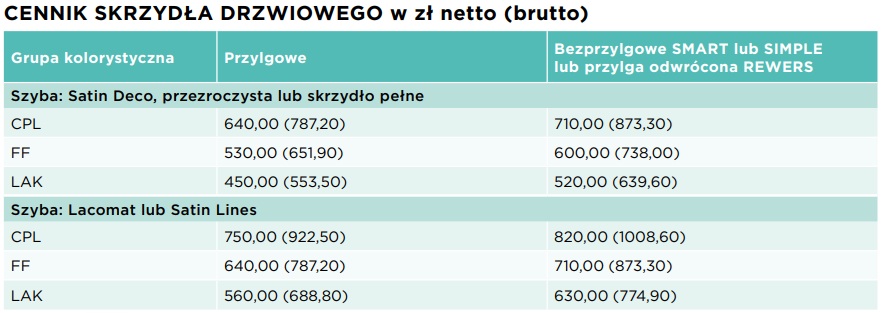 Dostępne opcje dodatkowe obejmują wypełnienie płytą pełną, trzeci zawias zwiększający wytrzymałość na obciążenia, krawędź soft (zaokrąglona, z obrzeżem wykładanym na powierzchnię skrzydła), podwójny ramiak drewniany oraz felc 20 mm. Ponadto, można zamówić drzwi w niestandardowych rozmiarach, w systemie dwuskrzydłowym lub przesuwnym, z technologią bezprzylgową SIMPLE, drzwi dwukolorowe, system Contrast, system rewersyjny, wzmocnienie pod samozamykacz oraz różne opcje wentylacji (podcięcie, tuleje lub kratka). Dodatkowo dostępna jest uszczelka opadająca.