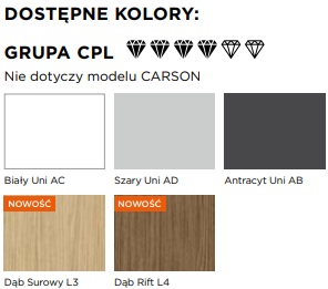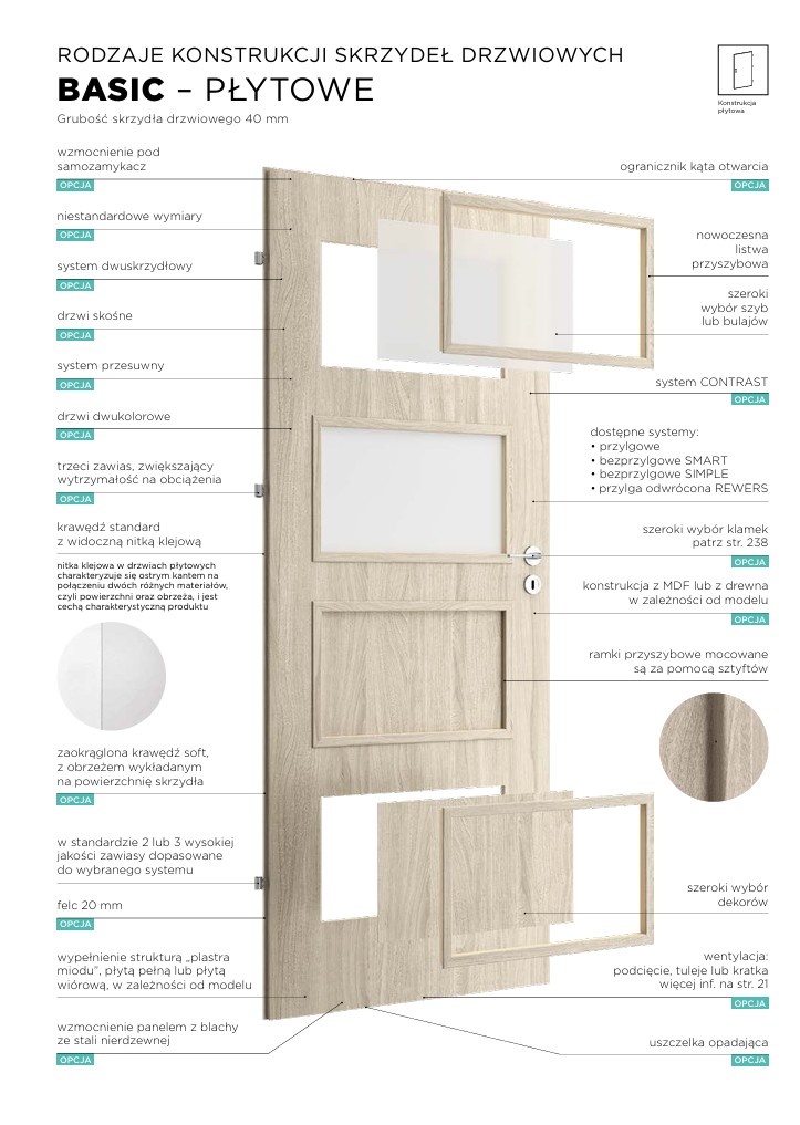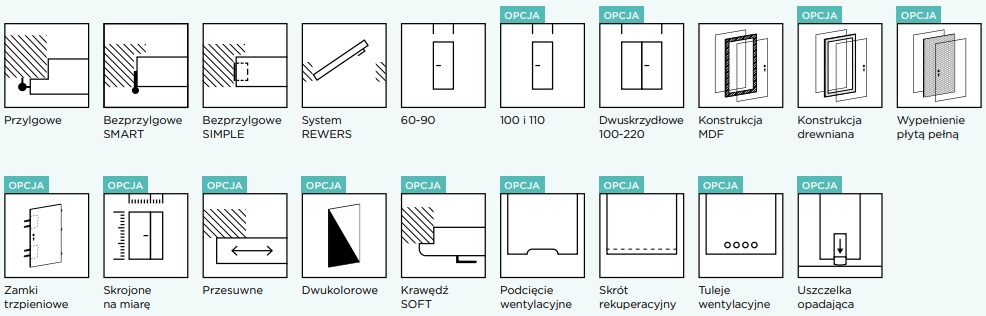 Dostępne opcje dodatkowe obejmują wypełnienie płytą pełną, trzeci zawias zwiększający wytrzymałość na obciążenia, krawędź soft (zaokrąglona, z obrzeżem wykładanym na powierzchnię skrzydła), podwójny ramiak drewniany oraz felc 20 mm. Ponadto, można zamówić drzwi w niestandardowych rozmiarach, w systemie dwuskrzydłowym lub przesuwnym, z technologią bezprzylgową SIMPLE, drzwi dwukolorowe, system Contrast, system rewersyjny, wzmocnienie pod samozamykacz oraz różne opcje wentylacji (podcięcie, tuleje lub kratka). Dodatkowo dostępna jest uszczelka opadająca.